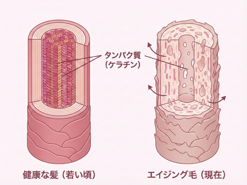 しかし、35歳を過ぎた頃から、女性ホルモンの変化や代謝の低下により、食べた栄養が髪の毛の末端まで届きにくくなります。さらに、長年のカラーリングや紫外線ダメージの蓄積により、髪内部のタンパク質が流出してしまうのです。