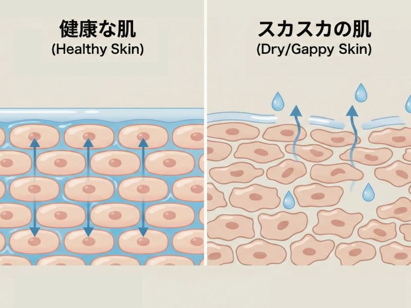 健康で美しい肌は、角層細胞がきれいに並び、その隙間が水分や脂分で満たされています。これがバリアとなり、外部刺激から守りつつ、内側の水分蒸発を防いでいます。