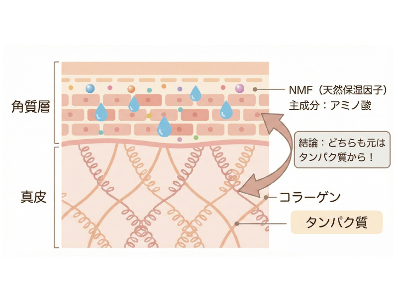 実は、このNMFの約半分は「アミノ酸」でできており、コラーゲンもまた「タンパク質」の一種です。つまり、肌の潤い成分の主原料は、すべてタンパク質から作られているのです。