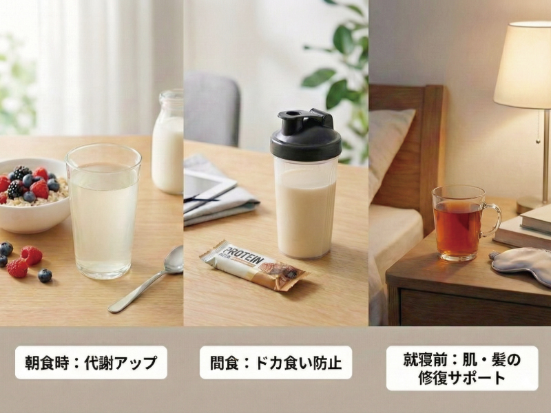 そこで役立つのがプロテインパウダーです。プロテインは余分な脂質や糖質をカットし、純粋なタンパク質を効率よく摂取できるように設計されています。 食事で足りない分(例えば1日10〜20g)をプロテイン一杯で補う。それはサプリメントを飲むのと同じ感覚で、非常に理にかなった「美容投資」なのです。