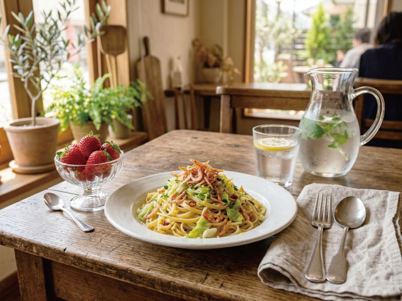「今日のランチは、春キャベツと桜エビのパスタにして、食後にイチゴを食べよう」