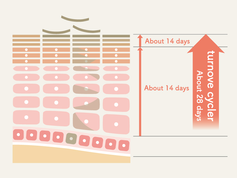 私たちの肌は、約28日周期で生まれ変わる「ターンオーバー」を繰り返しています。 万が一、紫外線によってシミの元(メラニン)が作られてしまっても、ターンオーバーが正常に働いていれば、古い角質とともに垢となってポロリと剥がれ落ちていきます。優秀なお掃除係が、毎日せっせとシミの卵を掃き出してくれるイメージですね。